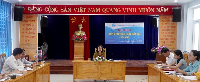 Hội LHPN tỉnh Quảng Bình vừa tổ chức Hội thảo phản biện xã hội đối với Dự thảo Luật Đất đai (sửa đổi). Tham dự có đại diện Đoàn Đại biểu Quốc hội tỉnh, Ủy ban MTTQVN tỉnh, các sở, ban, ngành liên quan. -