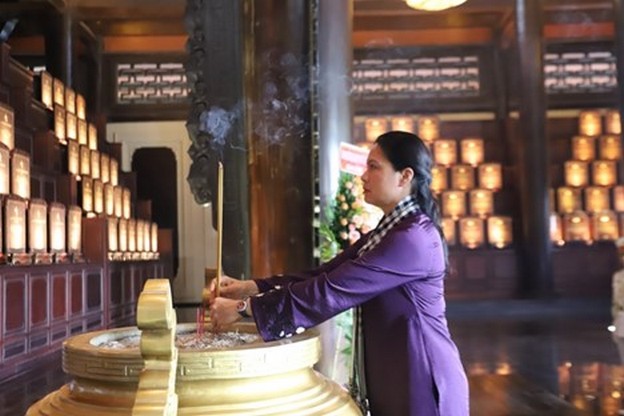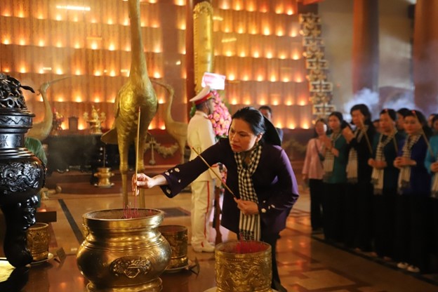 Bà Hà Thị Nga, Ủy viên Trung ương Đảng, Chủ tịch Hội LHPN Việt Nam, dâng hương tại Khu truyền thống Cách mạng Sài Gòn - Chợ Lớn - Gia Định.