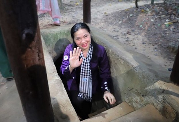 Bà Hà Thị Nga, Chủ tịch Hội LHPN Việt Nam, trải nghiệm tham quan đoạn đường hầm ngắn tại Địa đạo Củ Chi.