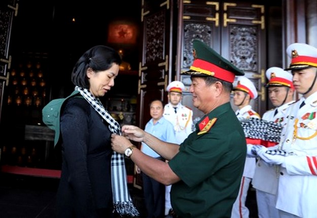 Nguyên Phó Chủ tịch Hội LHPN Việt Nam Trần Thị Hương được lãnh đạo địa phương tặng khăn rằn.