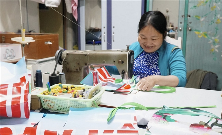 Bị khuyết tật teo chân bẩm sinh khiến việc đi lại khó khăn, bà Phạm Thị Nguyện làm nghề may vá, sửa quần áo thuê nhưng thu nhập ít ỏi và không đều. Từ ngày được Hội LHPN phường tạo điều kiện, gia đình bà có thêm một nguồn thu nhập từ những chiếc túi tái chế. “Mỗi chiếc túi, tôi được trả công 5.000 – 6.000 đồng. So với việc may quần áo thì may túi là quá dễ rồi. Bình thường thì cứ túc tắc làm thôi, khi có đơn đặt hàng nhiều thì tôi cũng phải may thêm cả đêm hôm cho kịp nhưng không hề thấy vất vả mà chỉ thấy vui thôi” – bà Nguyện chia sẻ.