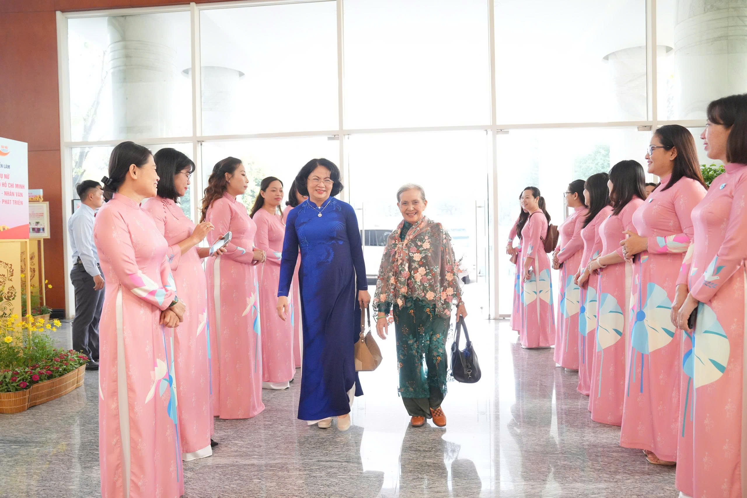 Nguyên Bí thư Trung ương Đảng, nguyên Phó Chủ tịch nước, nguyên Chủ tịch Hội LHPN Việt Nam Trương Mỹ Hoa (thứ 3 từ phải qua); nguyên Phó Chủ tịch nước, nguyên Phó Chủ tịch Thường trực Hội LHPN Việt Nam Đặng Thị Ngọc Thịnh ( bìa phải, hàng sau) cùng các đại biểu tham quan không gian triển lãm, trưng bày trong khuôn khổ Đại hội