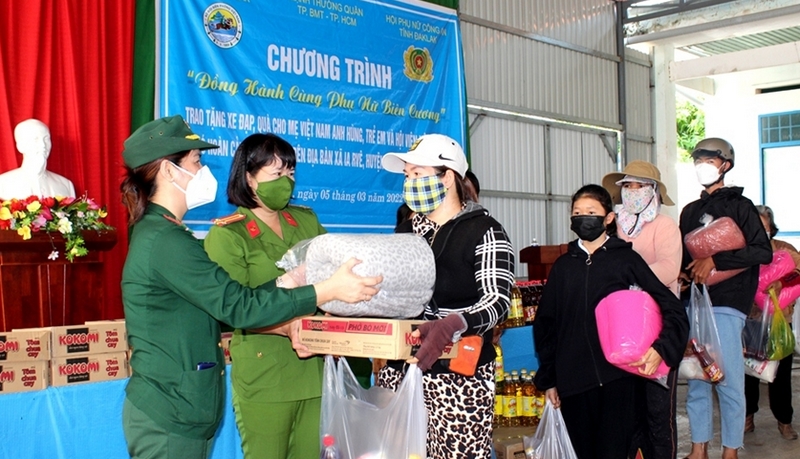 Từ năm 2016 đến nay, Hội phụ nữ Bộ đội Biên phòng tỉnh đã tích cực phối hợp, tham gia với Hội Liên hiệp phụ nữ tỉnh Đắk Lắk huy động sự chung tay, đóng góp của các cấp, các ngành, cơ quan, doanh nghiệp, các nhà hảo tâm tặng quà, hỗ trợ sinh kế cho các gia đình phụ nữ có hoàn cảnh khó khăn tại 4 xã biên giới Krông Na, Ea Bung, Ia Rvê, Ia Lốp. Thông qua đó, giúp 8 gia đình hội viên phụ nữ các xã biên giới được tiếp cận vốn vay khởi nghiệp, 12 gia đình phụ nữ được tặng nhà “Mái ấm tình thương”, hơn 1.000 suất quà, 30 con bò giống được trao cho các gia đình phụ nữ có hoàn cảnh khó khăn, trao tặng 50 chiếc xe đạp và 60 suất học bổng cho học sinh nghèo vượt khó với tổng trị giá hơn 2 tỷ đồng.