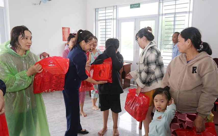 Phó Chủ tịch - Tổng Thư ký Nguyễn Thị Thu Hà tặng quà cho người dân vùng ngập lụt tại điểm tránh trú an toàn.