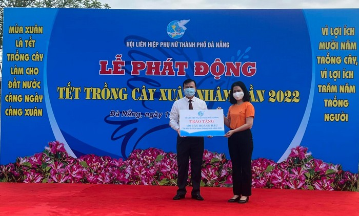 Chủ tịch Hội LHPN thành phố Đà Nẵng Hoàng Thị Thu Hương trao bảng trao tặng 100 cây Hoàng hậu cho Di tích Danh thắng Ngũ Hành Sơn