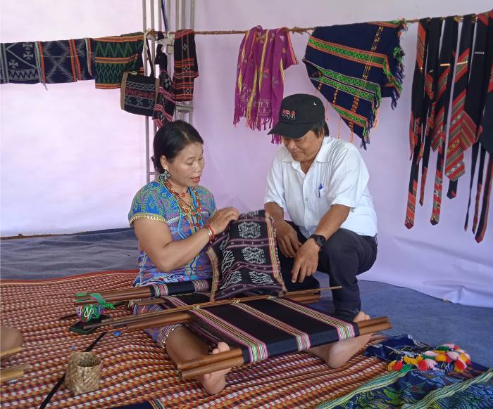 Chị Pơ Loong AGoóc đang giới thiệu với tác giả về qui trình dàn cườm tạo hoa văn trên nền vải thổ cẩm Cơ Tu