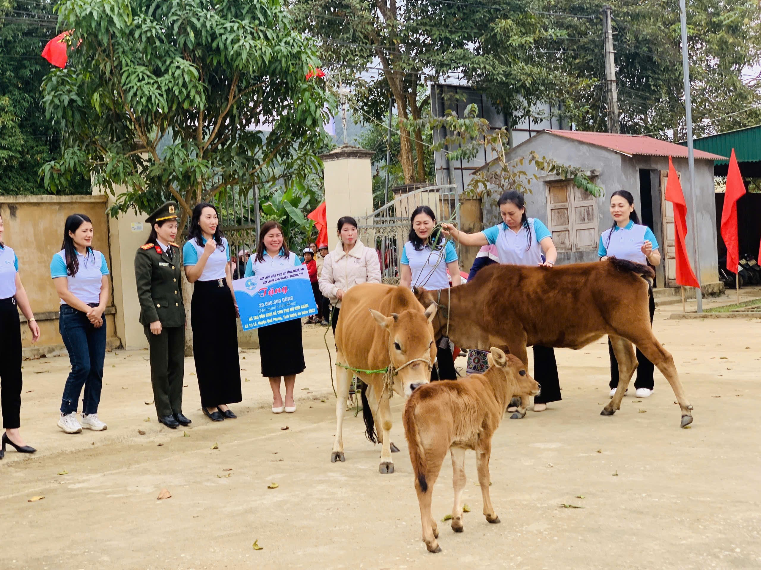 Bà Vi Thị Sinh (người cẩm biển) trao bò sinh kế cho hội viên