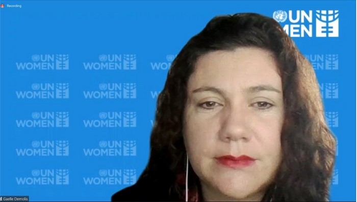 Bà Gaelle Demolis, Quyền Trưởng đại diện của UN Women tại Việt Nam phát biểu tại Hội thảo qua trực tuyến (Ảnh chụp màn hình)