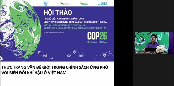Hội thảo “Phụ nữ Việt Nam tham gia hành động ứng phó biến đổi khí hậu và giảm thiểu rủi ro thiên tai” do Hội LHPN Việt Nam, Trung tâm Nghiên cứu Môi trường và Cộng đồng (CECR) với sự hợp tác của Mạng lưới các tổ chức phi chính phủ Việt Nam về Biến đổi Khí hậu (VNGO-CC) tổ chức theo hình thức trực tuyến đã diễn ra tại Hà Nội, sáng 09/11.