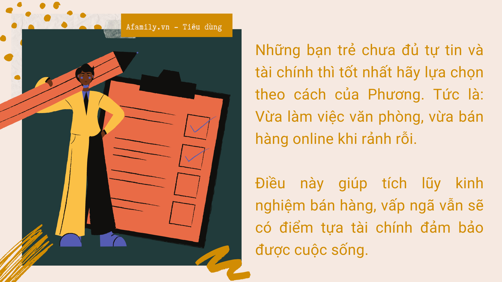 Phó Bảo Nam Phương (hiện đang sống tại Sài Gòn) vừa làm việc tại văn phòng lương hơn 10 triệu/tháng vừa mở 1 shop bán đồ si. Dù làm việc văn phòng với mức thu nhập hơn 10 triệu/tháng thì chị Phó Bảo Nam Phương (hiện đang sống tại Sài Gòn) vẫn nuôi mộng làm chủ shop bán đồ thời trang. "Mấy lúc mệt mỏi với sếp, áp lực với kpi, với khách hàng là mình lại có suy nghĩ start-up đó", chị Phương chia sẻ.