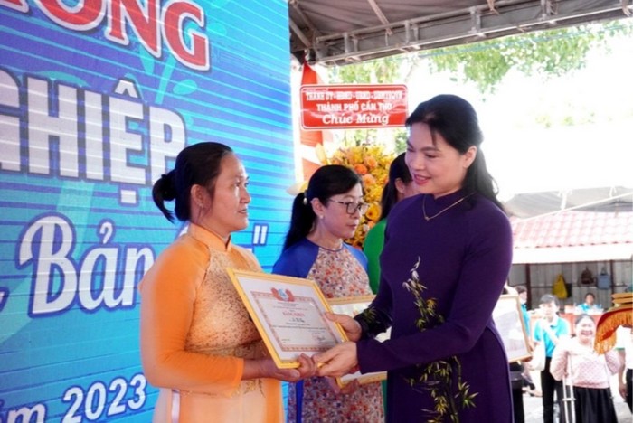 Bà HàThị Nga trao giải ý tưởng phụ nữ khởi nghiệp cho các cá nhân tại Ngày hội Phụ nữ sáng tạo - khởi nghiệp tại TP. Cần Thơ