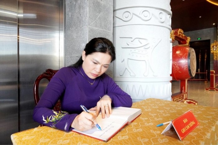 Chủ tịch Hội LHPN Việt Nam Hà Thị Nga ghi cảm tưởng tại Đền thờ Vua Hùng (thành phố Cần Thơ)