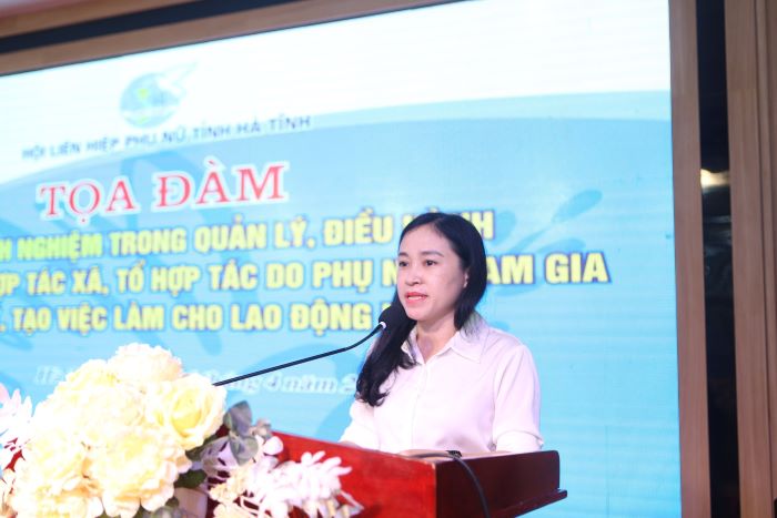 Toàn cảnh buổi Tọa đàm Xác định được tầm quan trọng của việc phát triển kinh tế tập thể, thời gian qua, các cấp Hội LHPN tỉnh Hà Tĩnh đã tích cực tham gia chủ trương đổi mới và phát triển kinh tế tập thể của tỉnh; chủ động phối hợp với các ngành chức năng thực hiện hiệu quả Đề án 939 của Chính phủ về “Hỗ trợ phụ nữ khởi nghiệp giai đoạn 2017 - 2025”, Đề án 01 “Hỗ trợ hợp tác xã do phụ nữ tham gia quản lý, tạo việc làm cho lao động nữ đến năm 2030”. Trong đó tập trung các hoạt động tuyên truyền, tập huấn nâng cao năng lực cho các hợp tác xã, tổ hợp tác, mô hình kinh tế; tổ chức các diễn đàn, các cuộc thi sáng tạo khởi nghiệp hoạt động, kết nối, tiêu thụ sản phẩm, biểu dương, tôn vinh nhằm khích lệ, tạo động lực và lan tỏa tinh thần đổi mới, sáng tạo trong hội viên phụ nữ; đẩy mạnh phát triển, nâng cao hiệu quả các THT, HTX do phụ nữ quản lý, tạo nhiều việc làm cho lao động nữ. Đến nay, trong số 1.025 Hợp tác xã trên toàn tỉnh, có 415 hợp tác xã (chiếm tỷ lệ 40,5%) có phụ nữ tham gia quản lý, tạo việc làm cho lao động nữ; trong số 2.579 THT trên địa bàn toàn tỉnh, có 342 THT (chiếm tỷ lệ 13,3%) do các cấp Hội phụ nữ vận động, hỗ trợ thành lập.