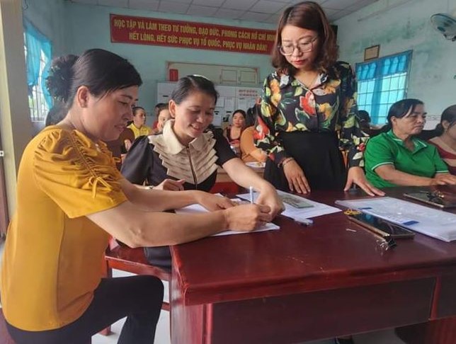 Cán bộ Hội hướng dẫn hội viên phụ nữ ký nhận vốn giải ngân