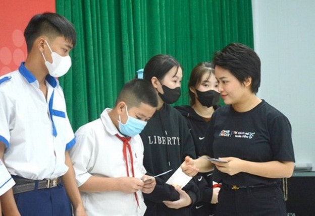 Chị Phạm Thị Bích Liên, Trưởng bộ phận Vận hành Tiếp thị và Phát triển Bền vững Home Credit Việt Nam, trao quà cho trẻ em có hoàn cảnh khó khăn trên địa bàn tỉnh Bạc Liêu