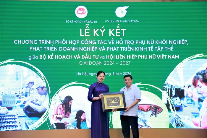 Bộ trưởng Bộ Kế hoạch & Đầu tư Nguyễn Chí Dũng và Chủ tịch Hội LHPN Việt Nam Hà Thị Nga ký kết Chương trình phối hợp chiều 12/8 Chương trình phối hợp nhằm nâng cao hiệu lực, hiệu quả trong thực hiện chủ trương của Đảng, chính sách pháp luật của Nhà nước về phát triển kinh tế tập thể, hợp tác xã, hỗ trợ doanh nghiệp phát triển, nhất là các doanh nghiệp, hợp tác xã do phụ nữ tham gia quản lý, tạo nhiều việc làm cho lao động nữ; phối hợp tổ chức thực hiện có hiệu quả Luật Hỗ trợ doanh nghiệp nhỏ và vừa; Luật Hợp tác xã năm 2023 và thực hiện các Đề án của Chính phủ góp phần thúc đẩy bình đẳng giới trong lĩnh vực hỗ trợ phát triển doanh nghiệp, hợp tác xã, nâng cao quyền năng kinh tế của phụ nữ.