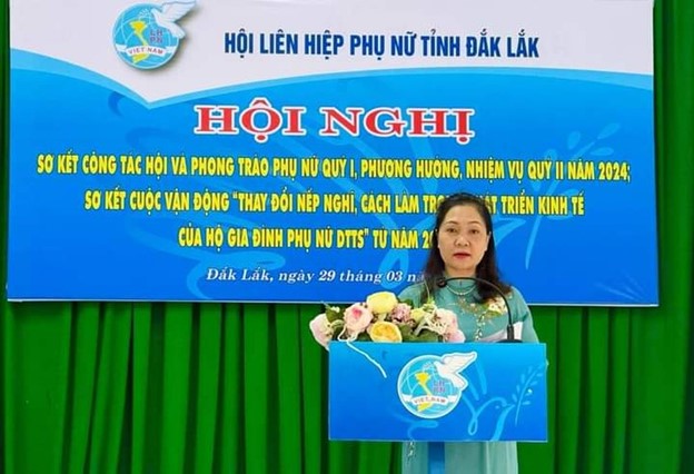 Bà Tô Thị Tâm - Chủ tịch Hội LHPN Đắk Lắk phát biểu tại Hội nghị sơ kế Cuộc vận động "Thay đổi nếp nghĩ, cách làm trong phát triển kinh tế của hộ gia đình phụ nữ DTTS" 2023-2024