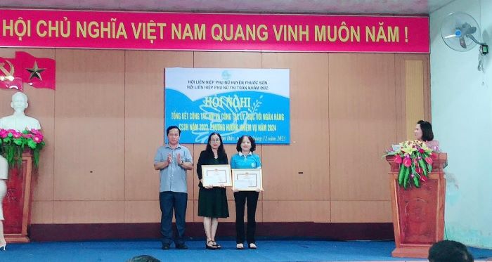 Chị Nguyễn Thị Thuận (đứng giữa) nhận giấy khen hoàn thành xuất sắc nhiệm vụ năm 2023.