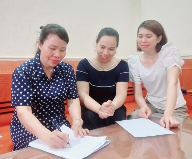 Bà Lưu Thị Hường (bìa trái) - Chủ tịch LHPN xã Gia Thanh - trao đổi cùng hội viên HTX