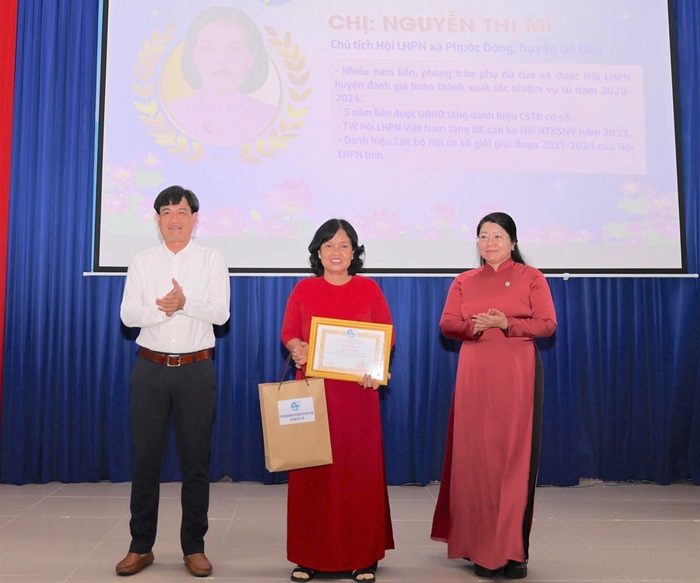 Chị Nguyễn Thị Mì (ở giữa) là gương điển hình xuất sắc cấp tỉnh được tôn vinh, biểu dương và khen thưởng tại Hội nghị điển hình tiên tiến lần thứ V của Hội LHPN tỉnh Tây Ninh