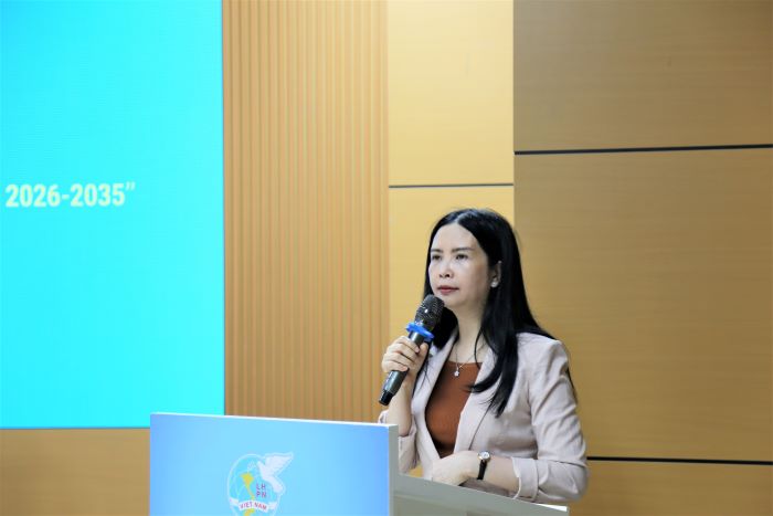Bà Trần Thị Thu Hà, Phó trưởng ban phụ trách, Ban Kinh tế - Xã hội, TW Hội LHPN Việt Nam, trình bày Dự thảo Đề án “Hỗ trợ phụ nữ khởi nghiệp giai đoạn 2026 - 2035”