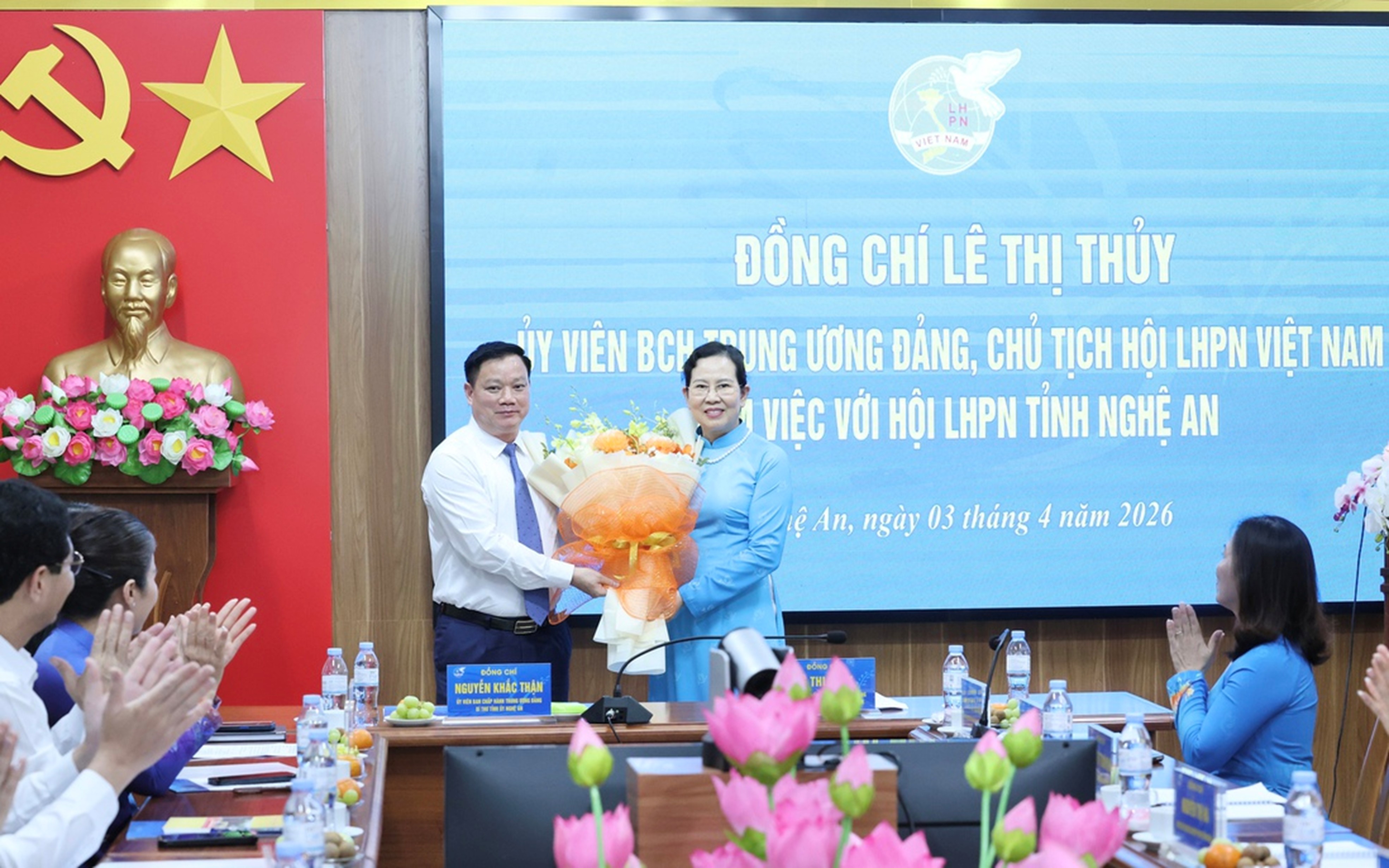 Ủy viên TƯ Đảng, Bí thư Tỉnh ủy Nghệ An Nguyễn Khắc Thận chúc mừng Ủy viên TƯ Đảng, Chủ tịch Hội LHPN Việt Nam Lê Thị Thủy Cùng tham dự buổi làm việc có: Phó Chủ tịch Thường trực Hội LHPN Việt Nam Trần Lan Phương; Phó Bí thư Tỉnh ủy Nghệ An, Chủ tịch Ủy ban MTTQ Việt Nam tỉnh Nghệ An Võ Thị Minh Sinh; Phó Chủ tịch Ủy ban MTTQ Việt Nam tỉnh, Chủ tịch Hội LHPN tỉnh Nghệ An Hoàng Thị Thu Hiền, cùng đại diện lãnh đạo Tỉnh ủy, Hội LHPN tỉnh Nghệ An.