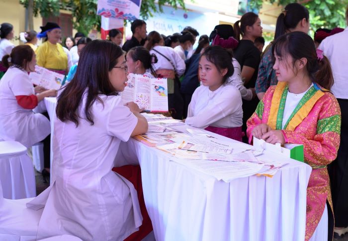 Chị em hội viên lắng nghe cán bộ y tế tư vấn chăm sóc sức khỏe Hà Giang là tỉnh miền núi, biên giới, dân số trên 89,2 vạn người (nữ chiếm 49,5%), với 87,7% là đồng bào dân tộc thiểu số (DTTS); tỷ lệ hộ nghèo đa chiều chiếm 42,61%, giao thông đi lại rất khó khăn; một số hủ tục, tập quán lạc hậu còn tồn tại; trình độ nhận thức của người dân còn hạn chế; tỷ lệ phụ nữ đến cơ sở y tế khám thai và chăm sóc sức khỏe bà mẹ trẻ em còn thấp (theo thống kê trong năm 2023 - 2024, số lượt phụ nữ được khám thai tại cơ sở y tế là 69.871, trong đó số phụ nữ DTTS khám thai/3 kỳ 9.802; số phụ nữ sinh đẻ được cán bộ y tế đỡ là 18.882, số phụ nữ sinh đẻ tại nhà còn cao, trên 3.458 ca).