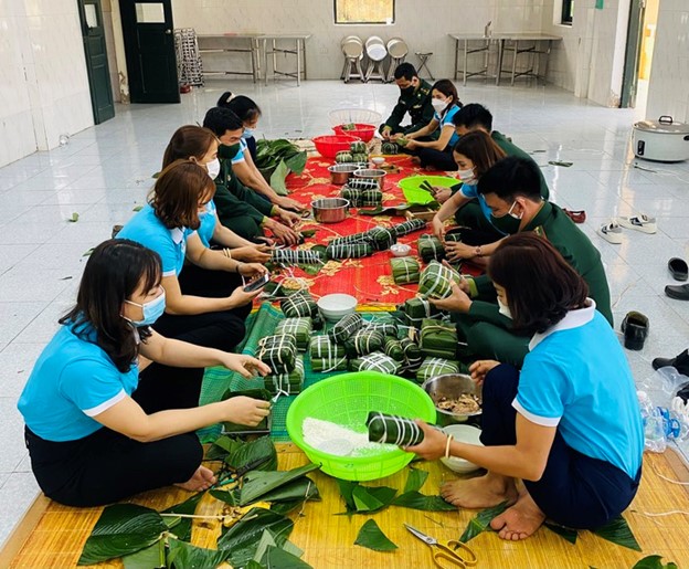 Hội viên, phụ nữ cùng bộ đội biên phòng gói bánh chưng dịp Tết