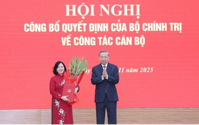Tổng Bí thư Tô Lâm trao quyết định về công tác cán bộ cho đồng chí Bùi Thị Minh Hoài Tham dự Hội nghị có: đồng chí Trần Cẩm Tú, Ủy viên Bộ Chính trị, Thường trực Ban Bí thư; đồng chí Lê Minh Hưng, Ủy viên Bộ Chính trị, Bí thư Trung ương Đảng, Trưởng Ban Tổ chức Trung ương; đồng chí Đỗ Văn Chiến, Ủy viên Bộ Chính trị, Bí thư Trung ương Đảng, Phó Bí thư Thường trực Đảng ủy Quốc hội, Chủ tịch Ủy ban Trung ương MTTQ Việt Nam; đồng chí Bùi Thị Minh Hoài, Ủy viên Bộ Chính trị, Bí thư Trung ương Đảng, Bí thư Thành ủy Hà Nội, Trưởng đoàn Đại biểu quốc hội Khóa XV Thành phố Hà Nội.