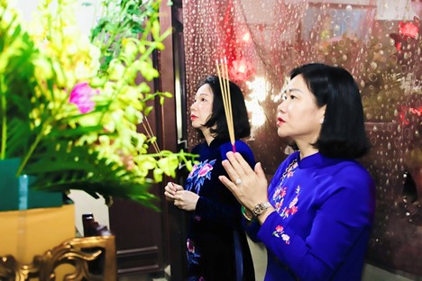 Ủy viên TƯ Đảng, Chủ tịch Hội LHPN Việt Nam Nguyễn Thị Tuyến (thứ 3 từ trái qua); Phó Chủ tịch UBND TP Hà Nội Vũ Thu Hà (thứ 4 từ trái qua) cùng các đại biểu dâng hương