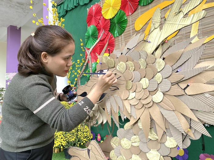Cô giáo mầm non vùng cao Quảng Ngãi trang trí linh vật rồng từ đồ tái chế