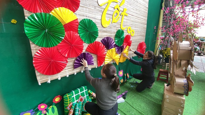 Ngoài ra, nhà trường đã phối hợp với phụ huynh tìm kiếm tre, lá để làm các gian hàng chợ quê, tạo không gian phiên chợ tết xưa, làm các món ăn ngày tết như bánh bó, bánh tét, bánh chưng, vẽ thư pháp, trang trí cây mai, đào…