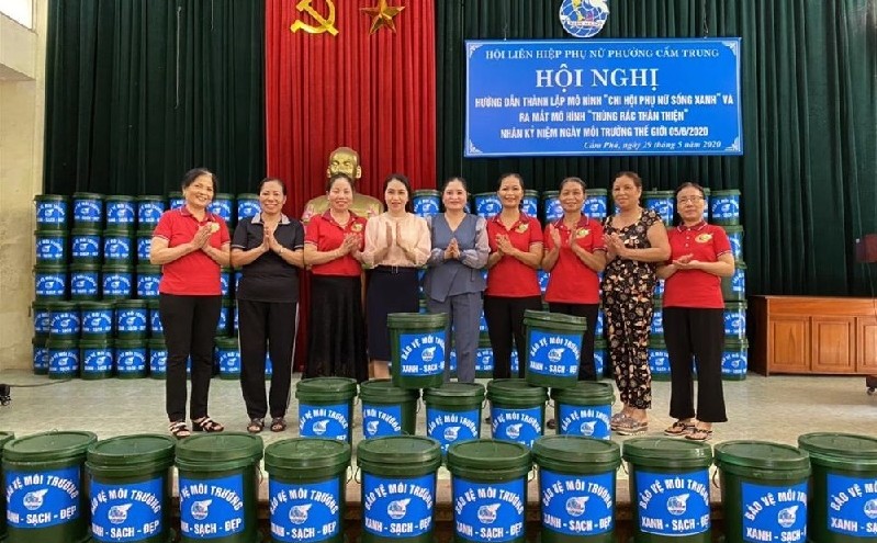 Hội LHPN phường Cẩm Trung (TP Cẩm Phả) bàn giao thùng rác cho hội viên và hướng dẫn các chi hội triển khai mô hình "Chi hội phụ nữ sống xanh". Bà Nguyễn Thị Vinh, Chủ tịch Hội LHPN tỉnh Quảng Ninh cho biết: Thực hiện cuộc vận động “Phụ nữ Quảng Ninh chung tay BVMT và thực hiện VSATTP", Hội LHPN tỉnh đã ban hành kế hoạch nâng cao hiệu quả, tính thực chất của phong trào “Xây dựng gia đình 5 không, 3 sạch”, tích cực vận động hội viên và nhân dân tham gia các hoạt động BVMT gắn với xây dựng nông thôn mới, đô thị văn minh. Qua đó, 100% Hội LHPN các địa phương chủ động trong việc tham mưu cho cấp ủy tổ chức các hoạt động BVMT; đồng thời, củng cố, nhân rộng các mô hình hiện có, tiếp tục xây dựng các mô hình mới do phụ nữ quản lý, nhằm giảm thiểu rác thải nhựa ra môi trường.