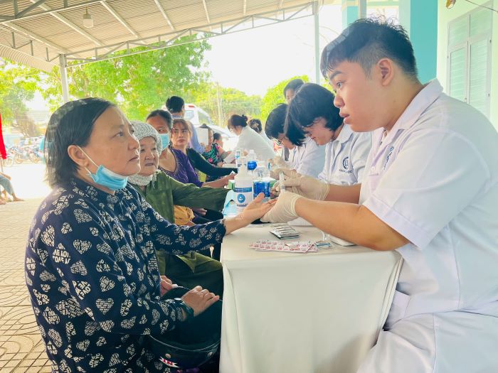 Các y bác sĩ đang khám bệnh và tư vấn sức khoẻ cho bà con Từ sáng sớm, hàng trăm phụ nữ đã tập trung tại điểm tổ chức, chờ đợi được thăm khám. Đội ngũ y bác sĩ từ Đại học Y Dược TP.HCM đã tiến hành khám bệnh, siêu âm, xét nghiệm đường huyết, đo huyết áp và cấp phát thuốc miễn phí. Ngoài ra, các chuyên gia y tế cũng tư vấn về chăm sóc sức khỏe sinh sản, dinh dưỡng hợp lý và biện pháp phòng tránh bệnh tật, giúp chị em nâng cao nhận thức về việc chăm sóc bản thân và gia đình.