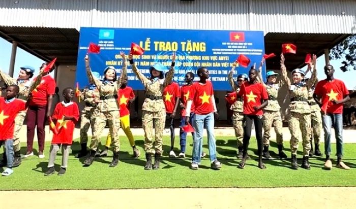 Vietnamese peacekeepers and Abyei residents at a gift presentation ceremony for local students and people. — Photo courtesy of Engineering Unit Rotation 4 Amid the barren and war-scarred land of Abyei, Vietnamese female peacekeepers are quietly yet resiliently delivering assistance to the local community.